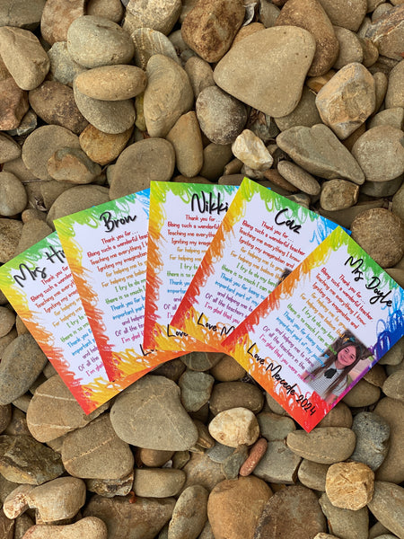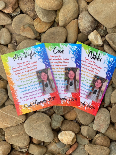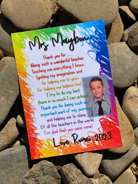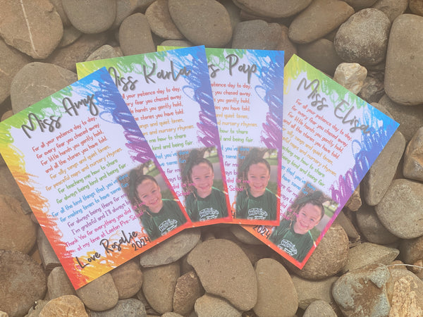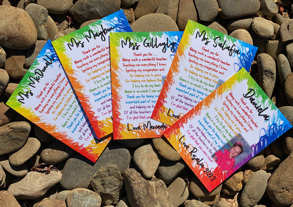 Please ensure you have the correct spelling of the teachers name and child's name as we will print exactly what you have sent through.